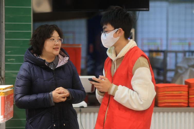 学院党委副书记王小露和学生志愿者沟通早餐发放情况